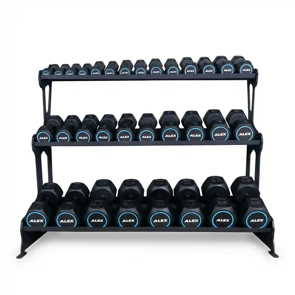 The Dumbbell Rack-R2 by Alexandave Industries Ltd offers maximum storage in minimum space. Its 3-tier design allows for the organization of a complete dumbbell set (approx. 16 pairs mixed) within a compact 1.4-meter footprint. Constructed from heavy-gauge steel sheet with a 335kg capacity, it features angled shelves for ergonomic access and safety. Ideal for home gyms and commercial spaces, it organizes weights from light to heavy in a stable, accessible, and professional display.
