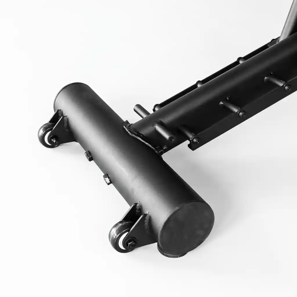 Despite its heavy-duty build (33kg), the bench is designed for easy movement. It features an integrated handle on the front leg and sturdy rubber casters on the rear. This “lift and roll” system allows virtually anyone to move the bench effortlessly around the gym floor. Whether you need to slide it into a power rack for bench presses or move it aside for deadlifts, the mobility ensures your gym space remains flexible and adaptable.