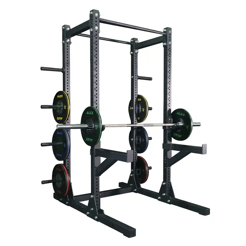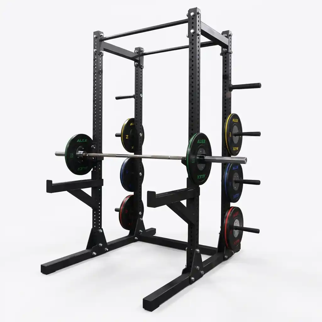 The Half Rack by Alexandave Industries Ltd is a commercial-grade powerhouse for heavy lifting. Built from massive 75x75mm steel tubing, it supports an immense 800kg load with absolute stability. Featuring quick-release J-hooks and safety spotter arms lined with HDPE to protect your barbell, it ensures safe solo training. The open-front design allows for versatile movement, while integrated plate storage keeps your gym organized. It is the ultimate professional station for squats, presses, and pull-ups.
