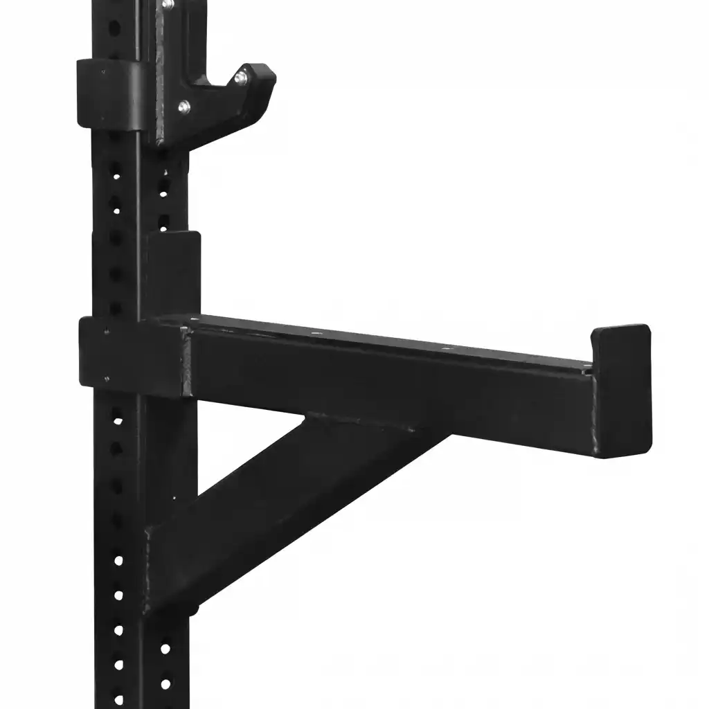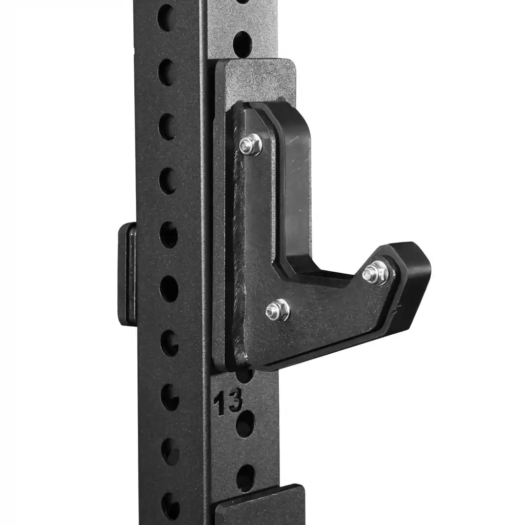 Functionality is maximized with premium attachments. The rack comes standard with commercial-grade J-hooks and safety spotter arms. These are lined with HDPE gaskets to protect the knurling of your barbell from metal-on-metal contact, preserving your investment. Both attachments feature a quick-release mechanism with laser-cut numbering on the uprights, making height adjustments fast and precise. The rear of the rack is equipped with 8 plate storage horns, allowing you to store tons of weight while adding further stability to the unit. With an integrated pull-up bar and band pegs capability, the Alex Half Rack is a professional-grade station for powerlifters, athletes, and serious home gym owners.