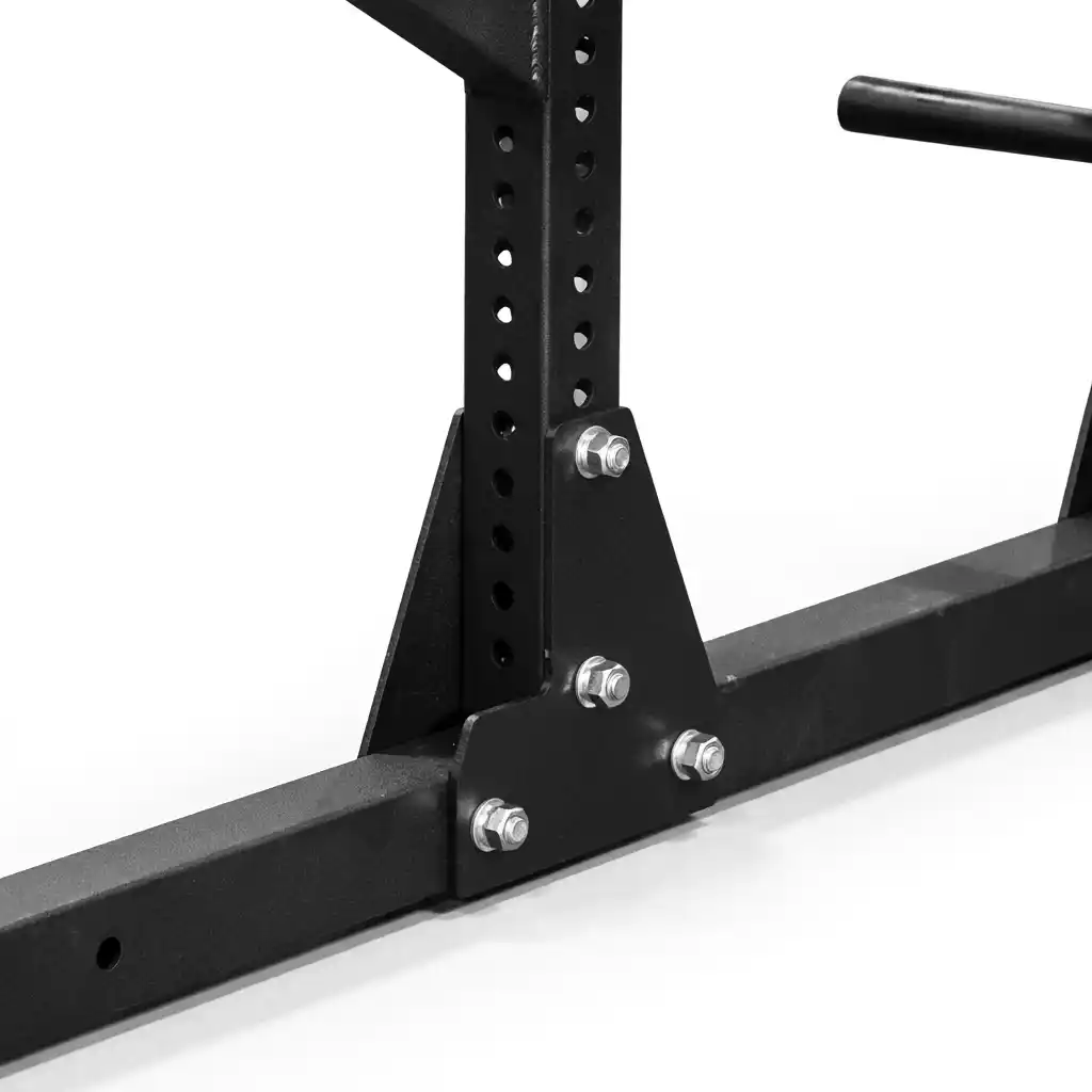 The rack features 8 weight horns on the rear uprights. This storage system keeps your plates organized and off the floor. More importantly, the weight of the stored plates anchors the rack to the ground, increasing its stability during dynamic movements like kipping pull-ups or racking heavy weights.