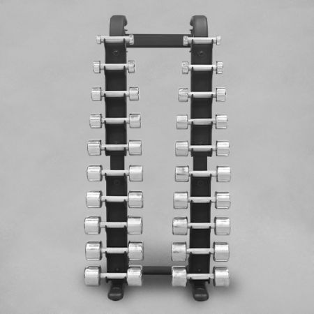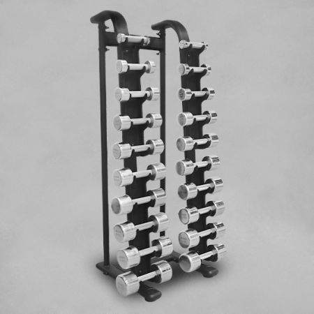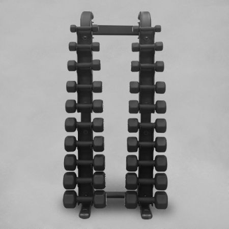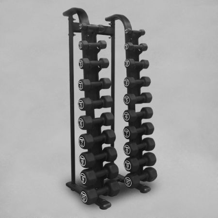 Almacenamiento para 10 pares de mancuernas de neopreno, cromadas o hexagonales. El rack vertical solo admite mancuernas de hasta 20 kg.