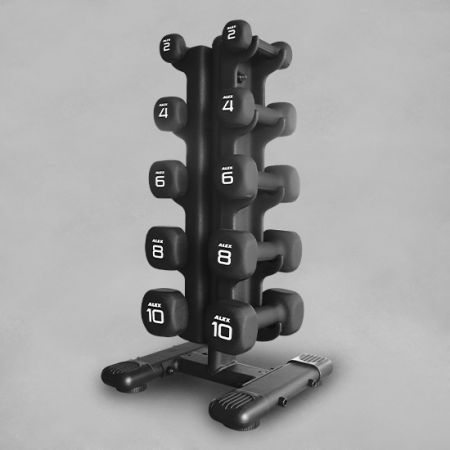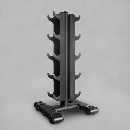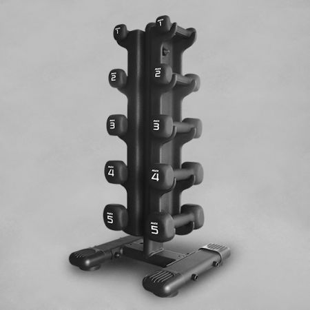 Almacenamiento para 5 pares de mancuernas de neopreno o cromo. El rack vertical solo admite mancuernas de hasta 10 kg.