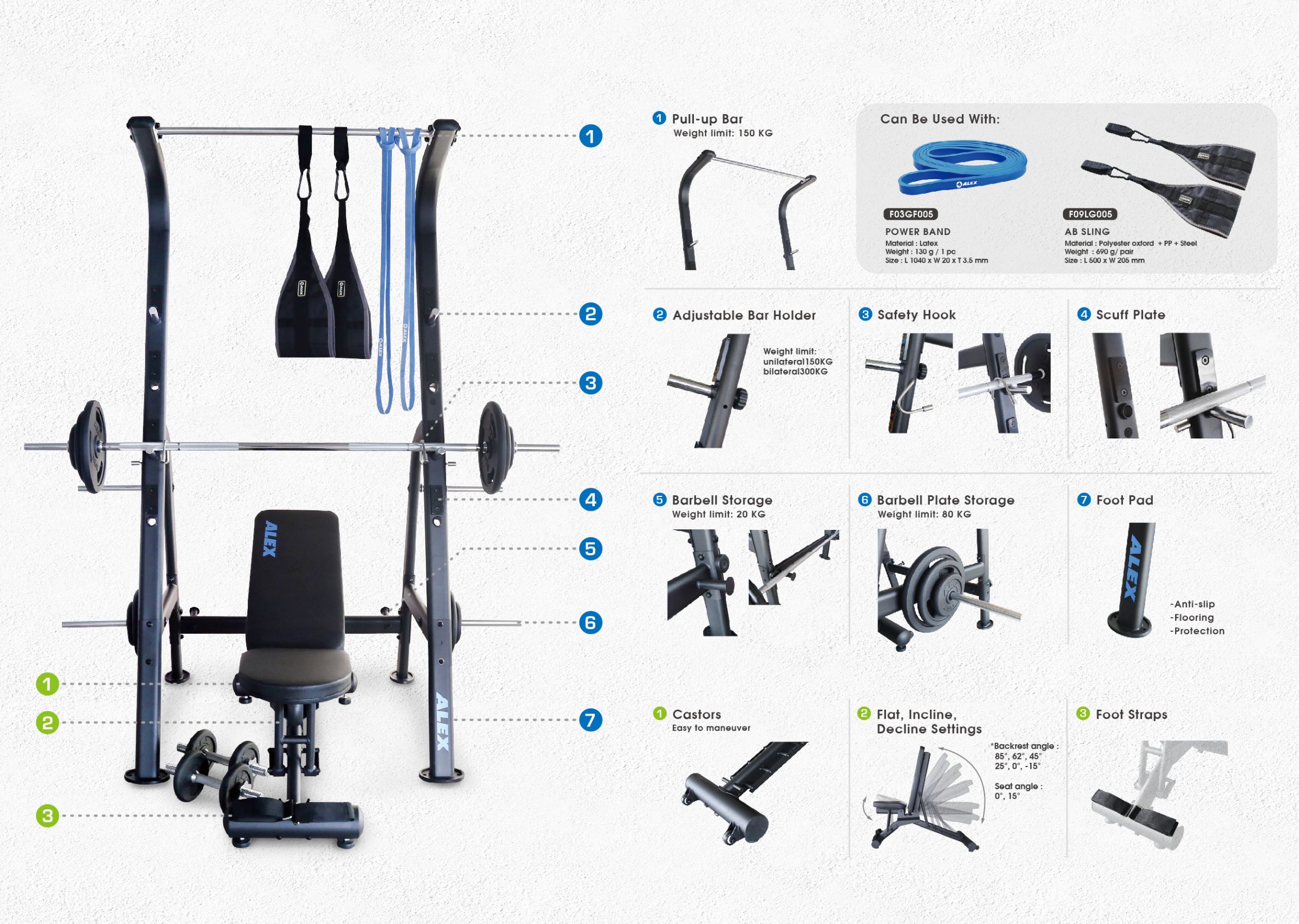 Il T-Fit è dotato di bilanciere standard da 28 mm per replicare le dimensioni dell'impugnatura del bilanciere olimpico, gancio di sicurezza da 8 mm con cuscinetto per la prevenzione degli incidenti e acciaio calibro 14 come standard di sicurezza richiesto, anche per i principianti. Attraverso un'esperienza di allenamento adeguata, ti invitiamo a dare forma alla tua vita.